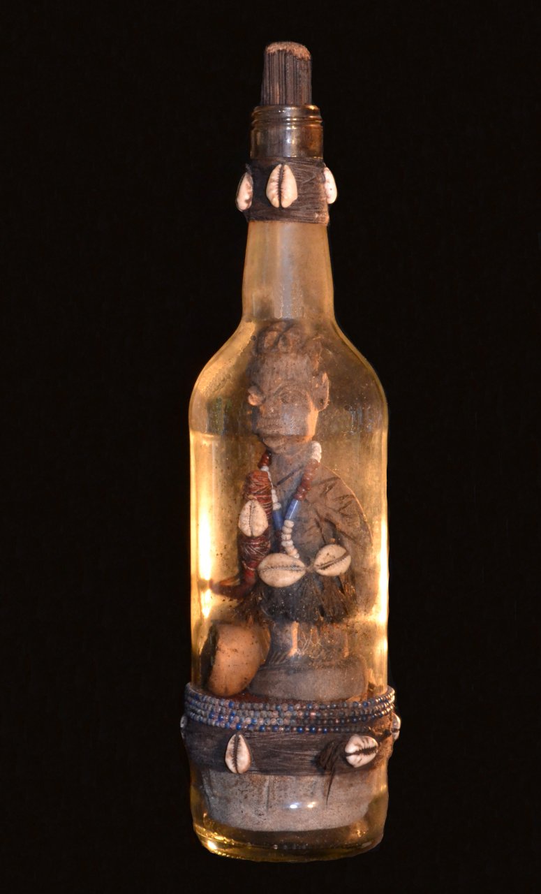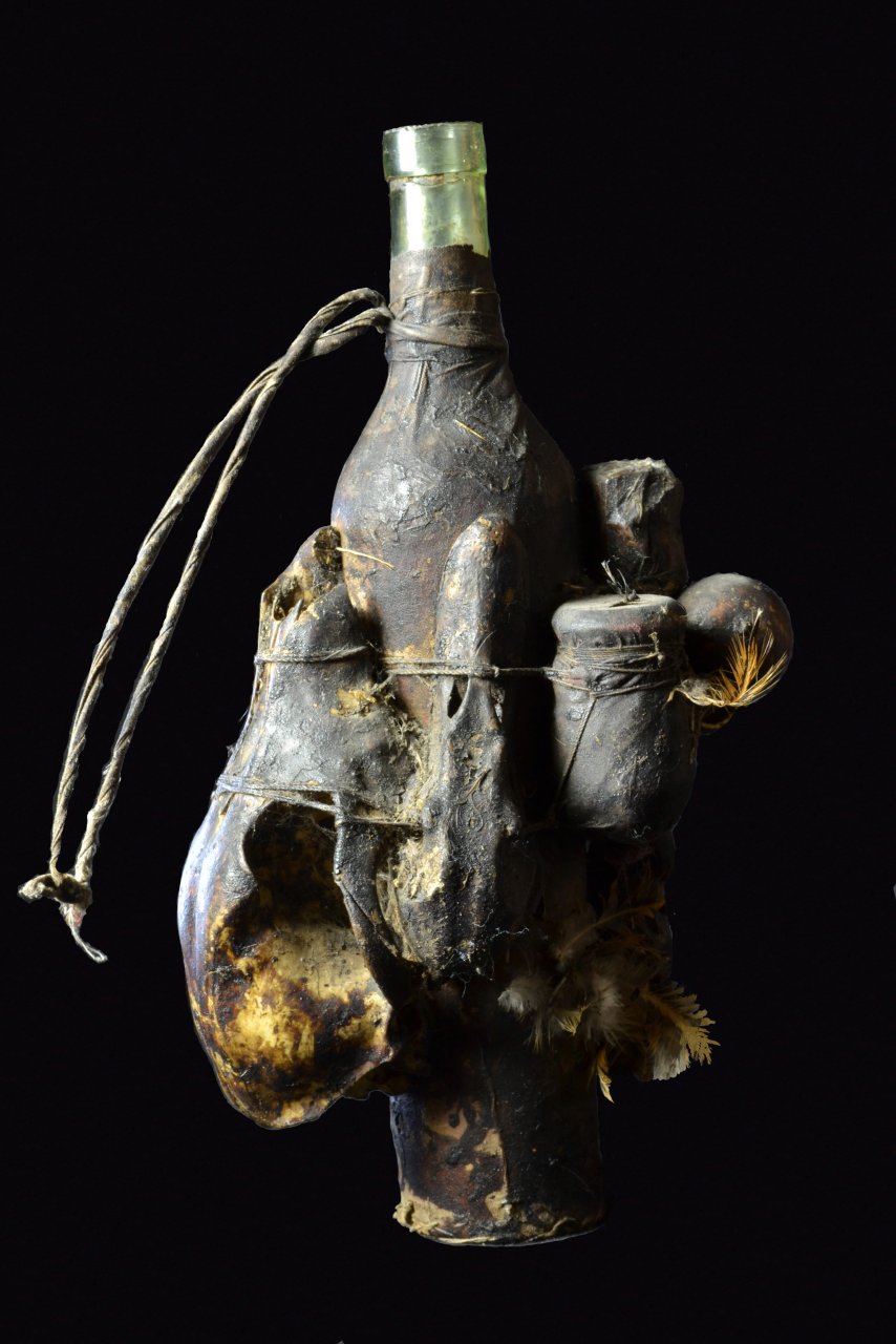 The bottle is filled with Sodabi, a palm liquor. Adepts drink from this bottle to gain power.
