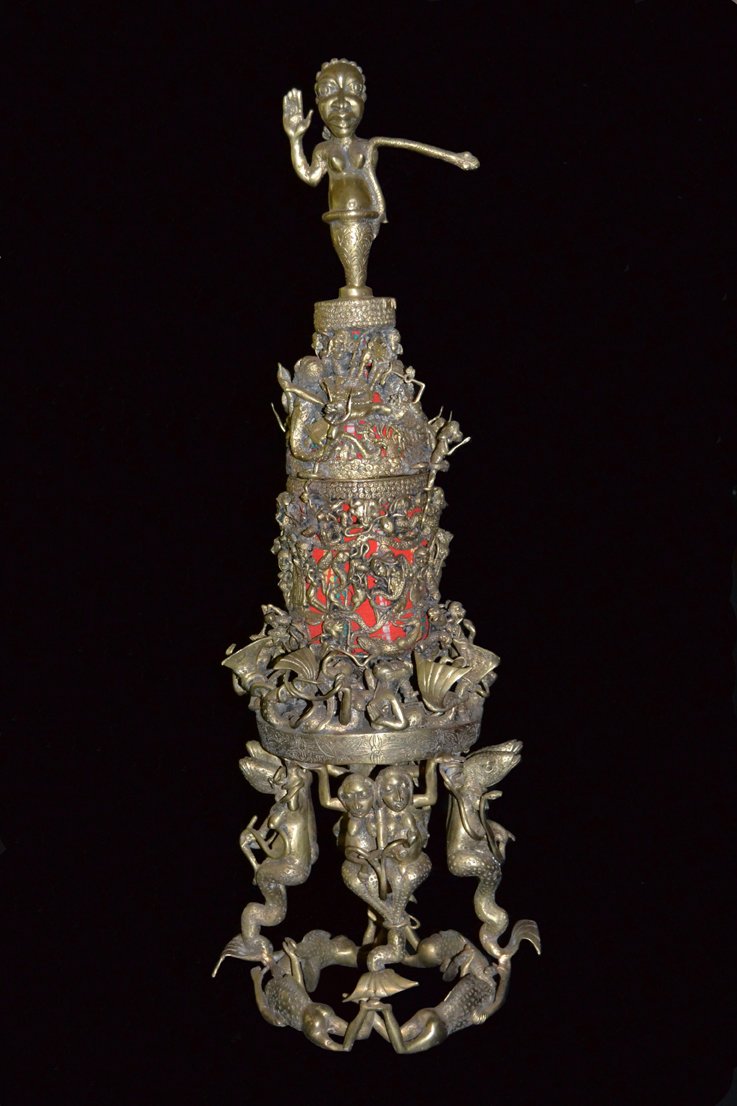 The altar is about 3 meter wide. The figures on the altar all appeared in dreams of the Vodun priest Djale who then told his carvers what he dreamt. There are 41 Tohoussou water spirits beside Mami Wata on the altar. On the floor are different terracotta figures made by Sowanou Ambede and bronze statues made by Ismaila Putuenchi. Offerings for Mami Wata are in a very old turtle shell.