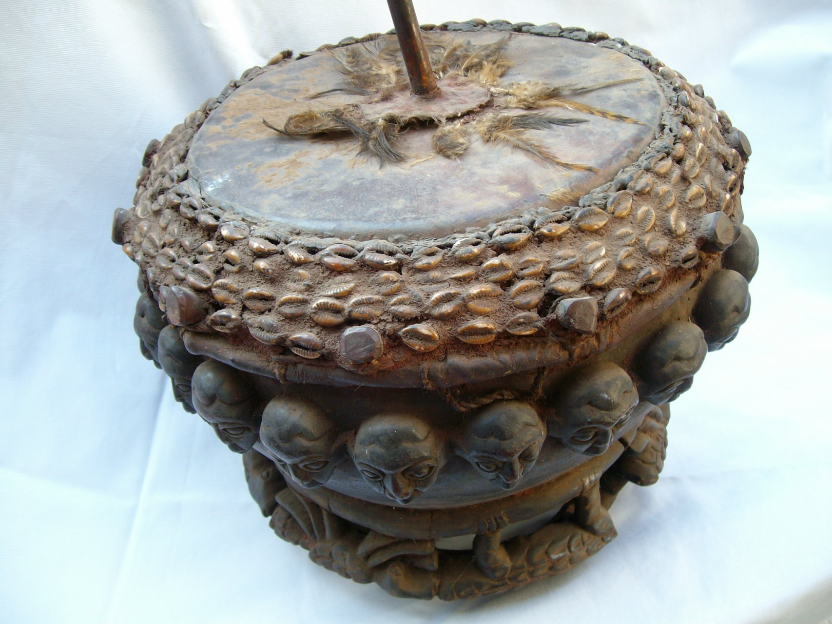 By rubbing the bamboo pole in the center of the drum it makes a eerie sound. The Chong secret society uses these drums at night to call the spirits.