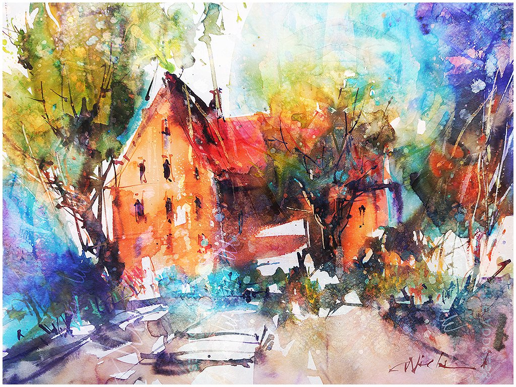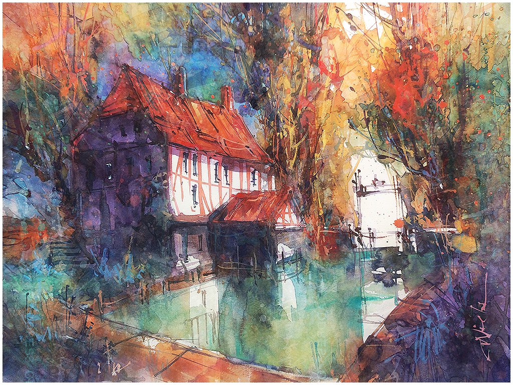 Fine Art Pigment Print under Acrylic Glass Acquarelli Luminosi #05 Fierry autumn at old mill - Carsten Wieland 2024 Open Edition Watercolor Art https://www.etsy.com/de/listing/1679202203 - Carsten Wieland