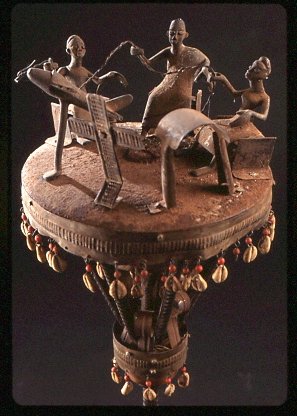 Asens a memorial for a dead ancestor, and tell the story of the ancestor. This asen shows the ancestor sitting on a stool and on each side is a wife. They are holding a rope to symbolize that his wives should keep the family together after his death. The airplane he is sending to Haiti to pick up the souls of family member that were enslaved and should be flown back through the gate to mother Africa.