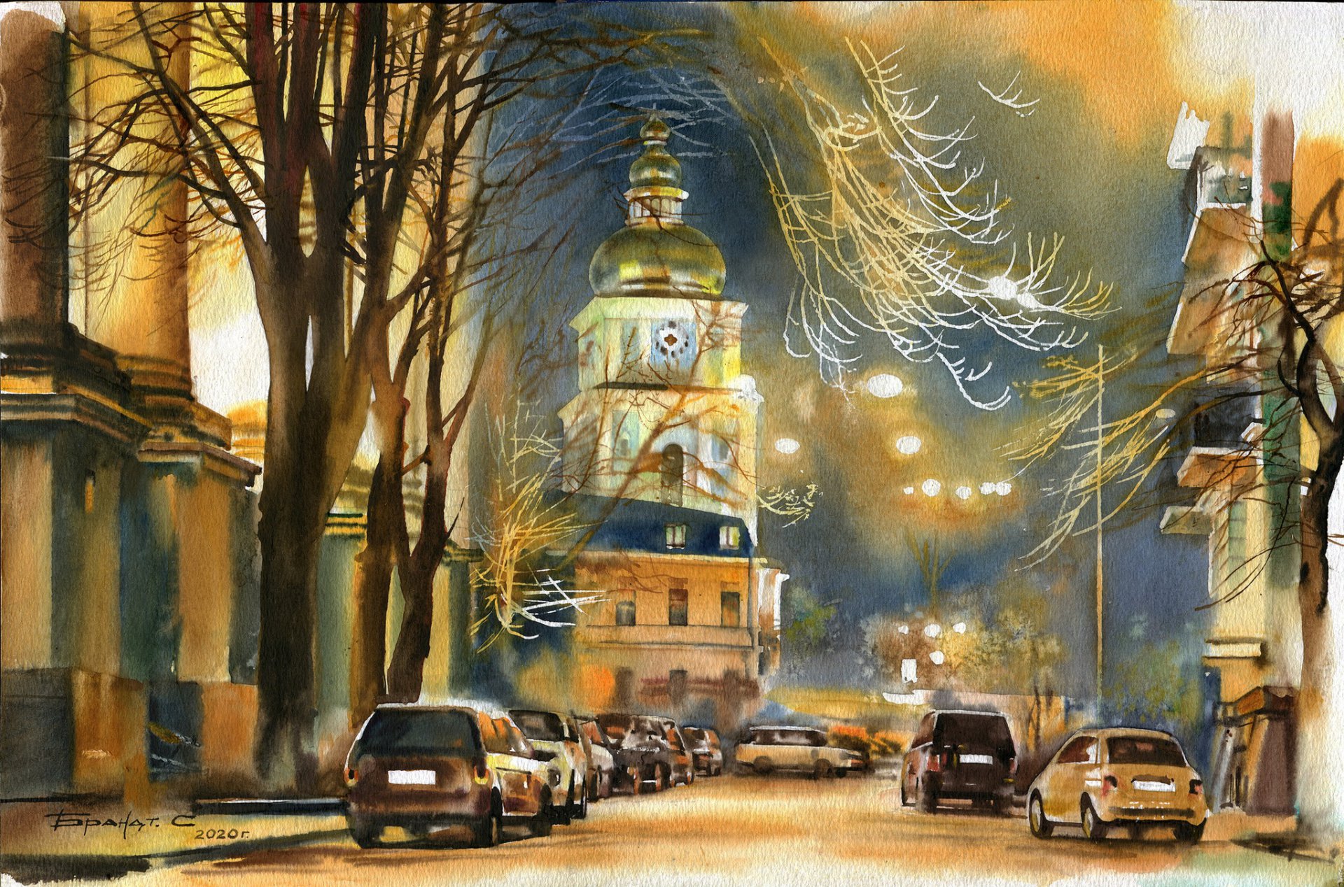 Honorable Mentions: Serhii Brandt, Ukraine Winter evenings.(St.Michael`s Cathedral) 2020 50x33cm - DoYouSpeakWatercolor?