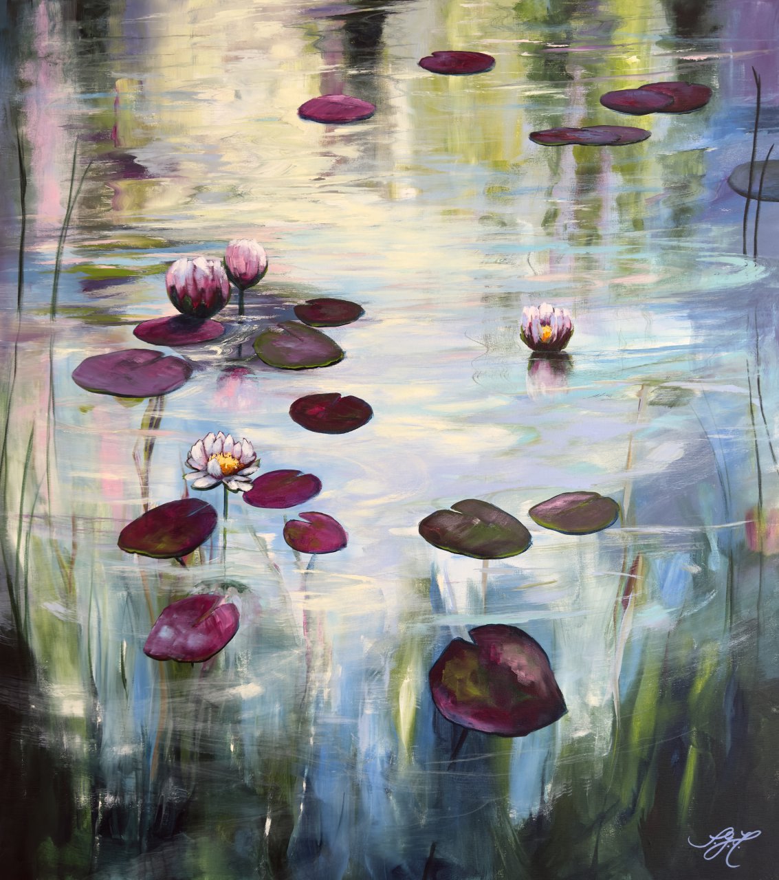 I capture the whisper of the water and the play of light here at a water lily pond. The water lilies bathe peacefully in the sun. The scene reflects peace and harmony. I want to bring this atmosphere into every room, an oasis of serenity that invites the viewer to pause and take a deep breath.